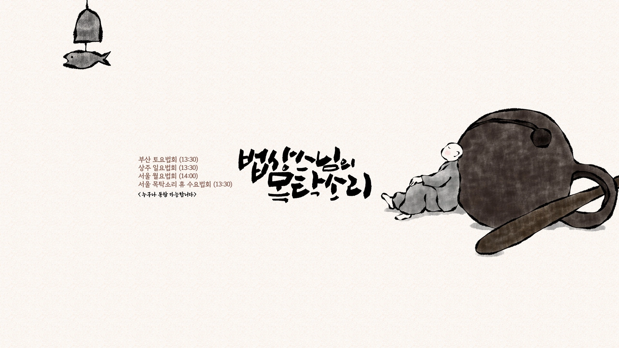 * 법상스님 법회 참석 안내 : 누구나 동참 가능 - 서울 수요법회 : 매주 수요일 13:30, 목탁소리휴 (서울시 강서구 강서로 463 새싹타워 1층 목탁소리휴) - 부산 토요법회 : 매주 토요일 13:30, 목탁소리 (부산시 해운대구 중동1로 25-1 더에이치빌딩 8층 목탁소리, 해운대역 도보 6분) - 상주 일요법회 : 매주 일요일 13:30, 대원정사 (경북 상주시 화동면 판곡2길 31 대원정사) - 법회 시 주차는 호수쪽 1열 주차 - 서울 월요법회 : 매주 월요일 14:00, 마포 불교방송 3층 법당 (서울 마포역 4번출구 직진 1분거리) - btn 불교tv 육조단경 법회(서울 목탁소리휴) : 매월 마지막주 목요일 10:00, 13:00 * 서울 목탁소리휴는 매일 11:30~20:30까지 문을 열고, 공휴일 및 일요일은 휴무합니다. * 상주 대원정사 평일 참배는 가능하지만, 카페는 일요일만 합니다. * 부산 목탁소리는 매