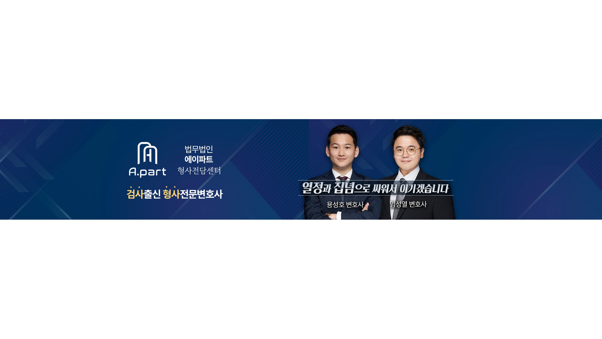 상담 문의: 070-7174-2392 안녕하세요. 법무법인 에이파트 형사전담센터, “형사전문변호사” 용성호, 김훈찬, 임성열 변호사입니다. 에이파트는 재산범죄, 성범죄, 마약사건 등을 전문적으로 다루는 형사 로펌으로 수많은 성공사례를 통해 쌓아올린 단단한 실력을 갖추고 있습니다. 무리하게 수임하지 않습니다. 젊은 패기로 의뢰인의 편에서 끝까지 싸우겠습니다. [용성호 변호사 약력] (현) 법무법인 에이파트 대표변호사 (주) 빈토리오 법률고문 (유) 스코프아시아 법률고문 (전) 법무법인(유) 율촌 변호사 전주지방검찰청 검사 인천지방검찰청 부천지청 검사 해병2사단 군법무관 국방부 기무사의혹특별수사단 군검사 해병6여단 군법무관 [김훈찬 변호사 약력] (현) 법무법인 에이파트 대표변호사 대한변호사협회 등록 형사 전문변호사 강동구의회 윤리심사자문위원 마포구 지역보건의료심의위원회 위원 (전) 국민권익위원회 대리신고자문변호사 육군 제7군단 자문변호사 AIP 특허법인, 법률사무소