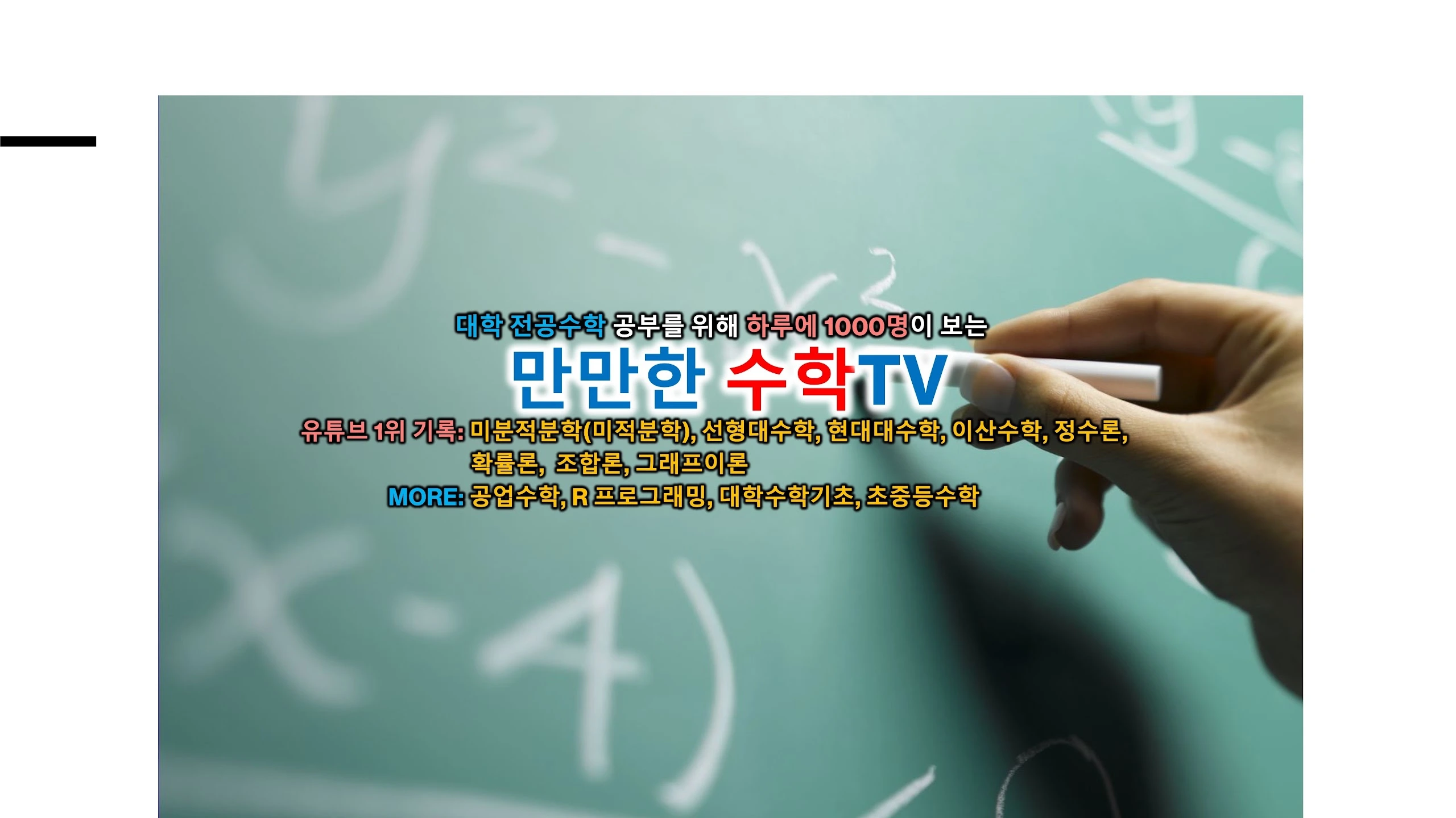 ** 유튜브 1위 기록: 미분적분학(미적분학), 선형대수학, 이산수학, 현대대수학, 정수론, 확률론, 확률및통계, 조합론, 그래프이론, 조합및그래프이론 ** 국내 최대 대학인강 사이트인 KOCW에서 두 강의 TOP 20 (정수론, 현대대수학, 총 3만여개의 강의 중) ** 새 강의: 공업수학(공학수학), 확률및통계, 선형대수학, R프로그래밍, 대학수학기초, 초등수학, 중등수학 현재 경희대 수학과 교수이며, 서울대 수학과를 졸업하고 미국 Emory University에서 박사학위를 받았습니다. 연구 시간을 위해서 모든 질문에 답변 드릴 수 없는 점을 양해해 주시기 바랍니다. 자유로운 답변을 환영합니다! == 강의슬라이드/중간기말고사/회원영상== 멤버십 가입 후 다운받거나 보실 수 있습니다. https://www.youtube.com/channel/UCDMP0s-HpSYf6ey7rQ1EN5Q/join == 대상 == 수학에 관심이 있으신 분, 영재원, KMO: 정수론 대학 입학생