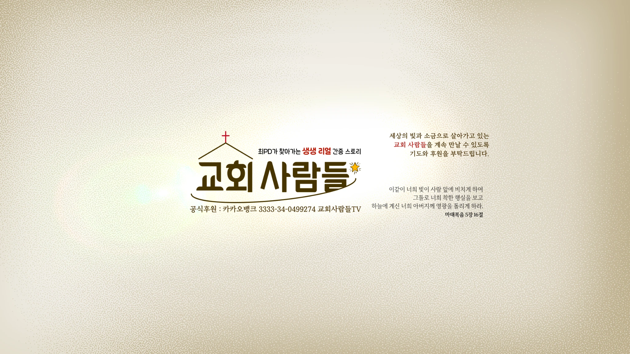 이같이 너희 빛이 사람 앞에 비치게 하여 그들로 너희 착한 행실을 보고 하늘에 계신 너희 아버지께 영광을 돌리게 하라.(마태복음 5장 16절) 서울신학대학교 신학대학원 M.div를 졸업한 최pd가 세상의 빛과 소금으로 살아가고 있는 교회 사람들을 찾아가 그분들의 아름다운 복음의 이야기를 전합니다. 예수 그리스도의 복음을 전하는 미디어가 될 수 있도록 많은 기도와 후원 부탁드립니다. 출연 및 비즈니스 문의 : [email protected] 후원계좌 : 카카오뱅크 3333-34-0499274 교회사람들TV KNJKA4@AICOMPANY