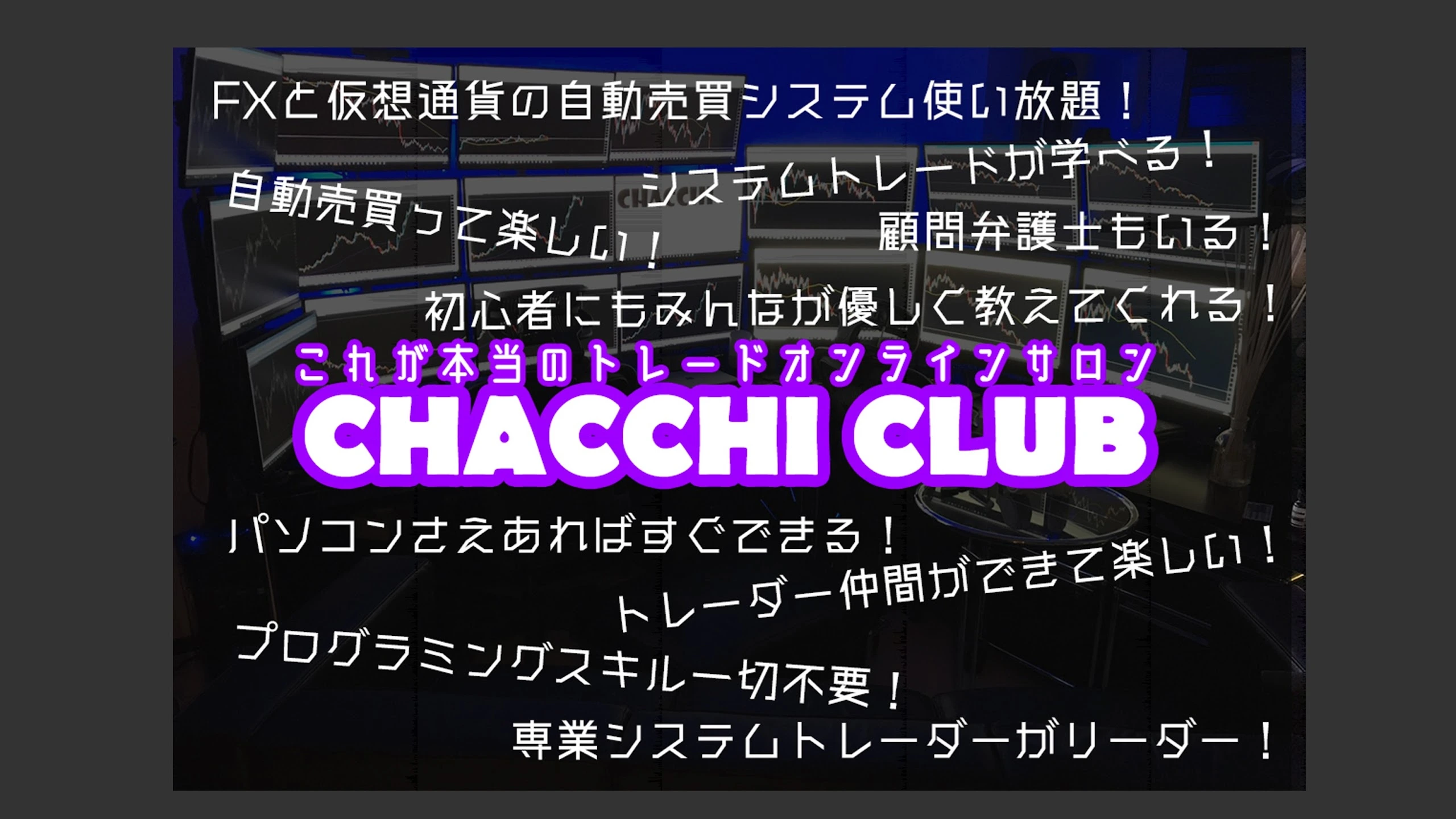 聖杯システムトレーダー集団【ちゃっち倶楽部】自動売買システムトレードオンラインサロン ■HPはこちら ⇒ https://www.chacchi13.com/ ■ちゃっち(運営)⇒ https://twitter.com/chacchi0013 ■ももんが(放送主)(ちゃっち倶楽部一期生) ⇒ https://twitter.com/v0w0vv0w0v ■ニコ生配信もやってます⇒ http://com.nicovideo.jp/community/co3607910