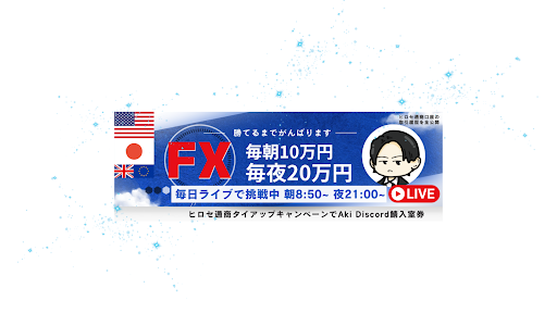 FXライブトレードで【毎朝10万円】【毎夕10万円】【毎夜20万円】稼ぐか損切か?可能な限り平日は毎日勝負をしています。朝は8:25~10:30、夕方は17時頃~、夜は21:00~24:00、目標金額に達する枚数、レバレッジ、取引回数を心がけますが、まれに終了時間までに目標に達しない場合があります。ご理解ください。 個人の見解ですが相場予想のポイントを解説、相場予想に基づいたトレードをライブで行います。 配信理由は次の事業の為に投資家として認知を広げたいからです。 最高月収は2億、最高損切は1.5憶 twitter @aki_fx1 Akiがライブで使用する【ヒロセ通商】タイアップキャンペーン※PR 本配信のQRコードor下記のリンクより口座開設で下定特典あり ■トレーダー交流・情報交換Discordサーバー「Aki鯖」への入室券 サーバー内で一緒にトレードしたり、トレード戦略や過去の参考になるライブ配信を限定公開します。 【↓ヒロセ通商タイアップキャンペーンはこちら】 https://click.j-a-net.jp/1808404/757690/ ・注意事項 当チャンネル及びコンテンツは投資に関する助言・勧誘等を行うものではありません。当チャンネルにアップロードされた動画やライブ配信内の情報は全て配信者の個人的な見解であり、為替トレードに関するテクニカル分析、予想、トレード戦略等、また株やCFD取引における将来の見通しが含まれる場合がありますが、それらの情報の正確性、有用性について保証するものではありません。 FX(外国為替証拠金取引)・仮想通貨取引・先物取引・オプション取引等レバレッジをかけた取引については、お預けになった証拠金以上の取引額で取引を行うため、証拠金以上の損失が出る可能性がございます。取引は自己の責任で行うようにしてください。当チャンネルのライブ配信はミラートレードを推奨する配信でもございません。 ・免責事項 当チャンネルからの発信情報を直接または間接に利用したことによって視聴者が損害を被った場合、いかなる場合においても当チャンネルは一切の責任を負うことができません。ご了承ください。FX(外国為替証拠金取引)や仮想通貨取引・株取引などの金融取引にはリスクがあります。トレードはリスクを十分に理解し、ご自身の責任で行ってください。