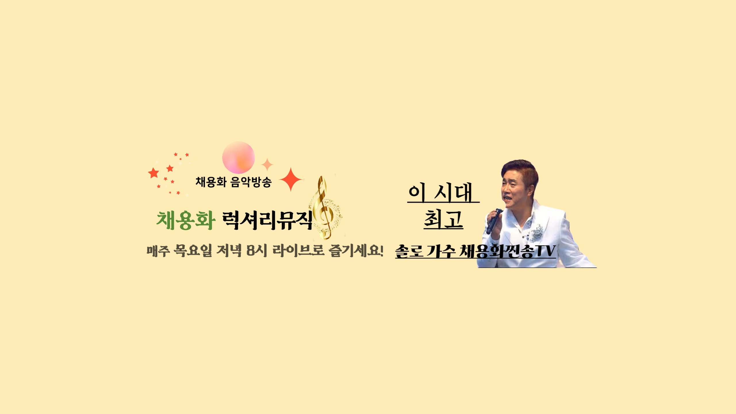 24년 실버스타 코리아TOP3 은상 안녕하세요 가수채용화의 찐송 럭셔리 뮤직을 찾아 주셔서 감사드립니다. 정통 음악 방송 음악 라이브 방송입니다 여러분들에 일과 휴식과 함께 하는 힐링 음악 방송입니다. 지친 일상에 위로와 마음에 평온함을 드리는 따뜻한 방송 잠시라도 위로가 되고 행복 하실 수 있게 최선을 다하겠습니다. 채용화를 늘 곁에 두시고 ^^ 행복하시길 바라며 늘 건강하세요. 감사합니다. 2020년 4.21일 10여년 만에 2집 발표 타이틀곡 "애련" 그사람, 내사랑 인천등 -24년 실버스타 코리아TOP3 은상 -2024.9.25. 제7회대평가요대상 인기상 수상 경력:2020년 KBS 연말 특집 "전국 가수 노래 자랑"출연 TV 라디오 수시 출연 중