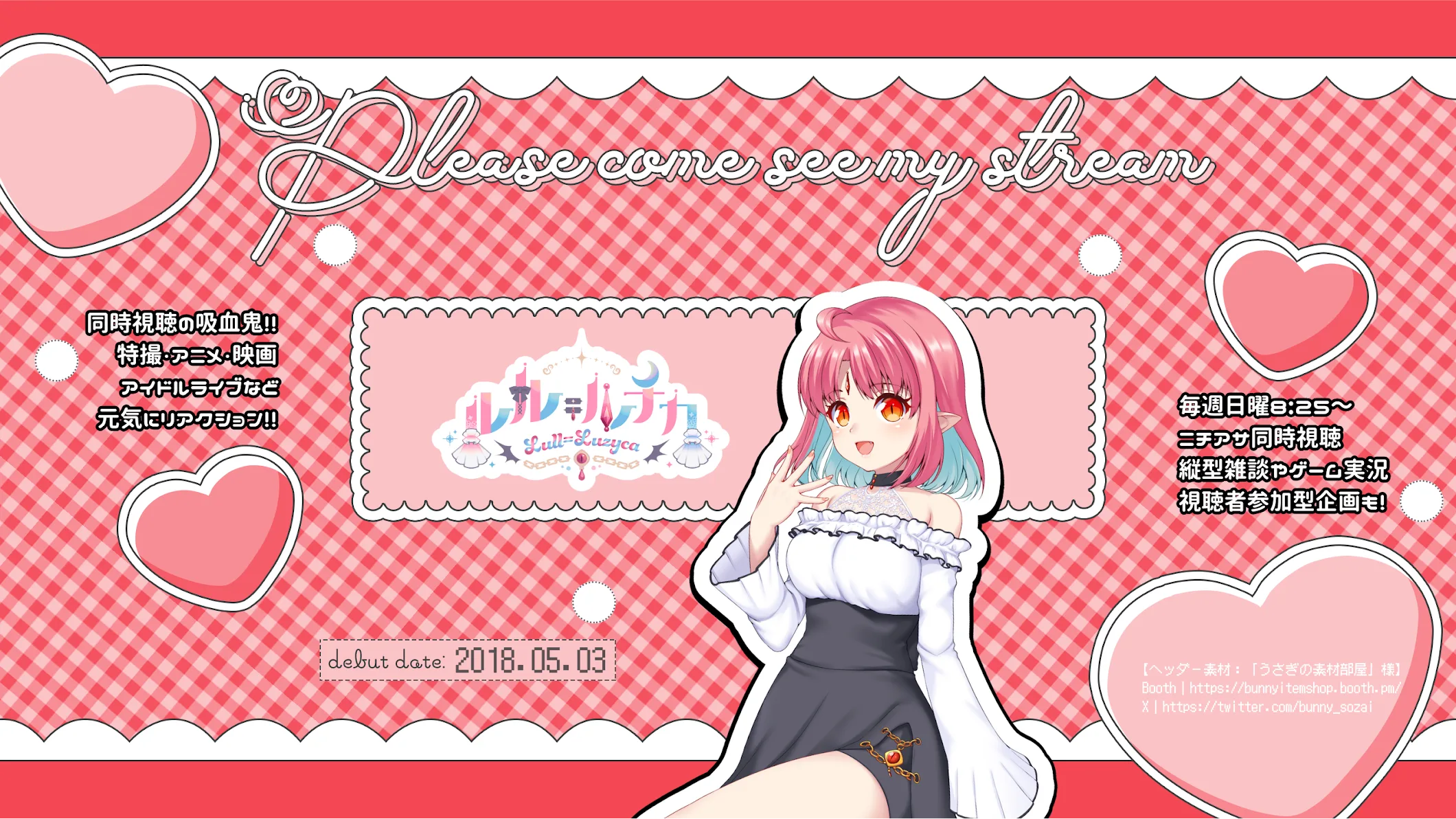 同時視聴の吸血鬼!長生き元気な個人勢! 人間さんたちの「好き」の感情を吸って生きてる 限界オタクなリアクションと分析力が長所 普段何やってるか分からない近所のお姉さんポジションを狙っているらしい 【主な同時視聴ジャンル】 特撮、アニメ、映画、ホラー番組、ライブ・イベント、演劇 【定期配信】 日曜 8:25 ニチアサ同時視聴 ーーーー ■アーカイブについて 過去動画は適宜非公開・限定公開・メンバー限定公開にしています 観て欲しいアーカイブは再生リストにまとめているので覗いてみてください! ■配信でお借りしています!いつもありがとうございます 背景素材:OKUMONO様 https://sozaino.site/ 映画 同時視聴背景:sozainabe様 https://booth.pm/ja/items/6216624 同時視聴用タイマー: SyncTimer 様 https://sync-timer.netlify.app/ BGM:白玉るーる様 https://shiratamarule.booth.pm/ SE:効果音ラボ様 https://soundeffect-lab.info/ コメント欄:わんコメ様 https://onecomme.com/ OBS画面:shoost MuRo様 https://muro.fanbox.cc/ ヘッダー素材:「うさぎの素材部屋」様 Booth|https://bunnyitemshop.booth.pm/ X|https://twitter.com/bunny_sozai ママ:みきぷらす様 https://x.com/miki_purasu Live2D:Akira★様 https://x.com/akira_vtube 新ロゴ制作:四ツ辻まよい様 https://www.youtube.com/channel/UCVqIgBYypTt9OuOC-3dyjMA 新楽曲制作:ればん様 『夜を告げる囁き』(初代イメージソング) 『紅-あかつき-は夜に囁く』(リブート後イメージソング) https://x.com/lbannen01 活動開始:2018/05/03