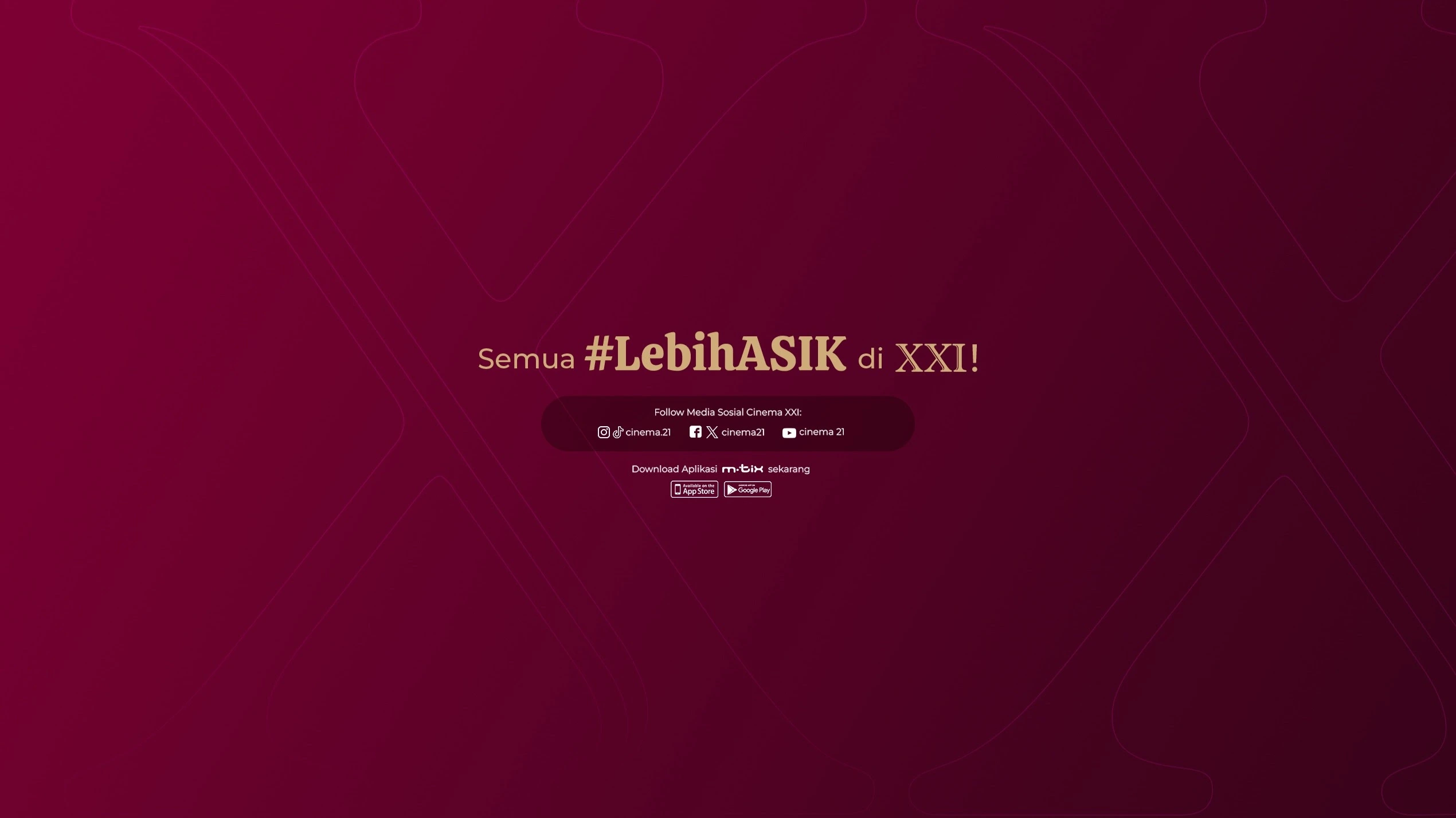 Download m.tix terbaru, biar nonton dan jajan jadi #LebihASIK! CINEMA 21 di bawah naungan PT. Nusantara Sejahtera Raya merupakan kelompok bioskop terbesar di Indonesia yang memulai kiprahnya di industri hiburan sejak tahun 1987. Lebih dari 32 tahun, CINEMA 21 berkomitmen untuk senantiasa memberikan pengalaman dan kenikmatan nonton terbaik untuk masyarakat Indonesia. Sampai dengan Januari 2020, CINEMA 21 memiliki total 1176 layar tersebar di 51 kota di 217 lokasi di seluruh Indonesia. Selain menyajikan film-film hasil karya anak bangsa, CINEMA 21 juga menayangkan film-film berkelas dunia. Informasi lengkap klik: www.21cineplex.com